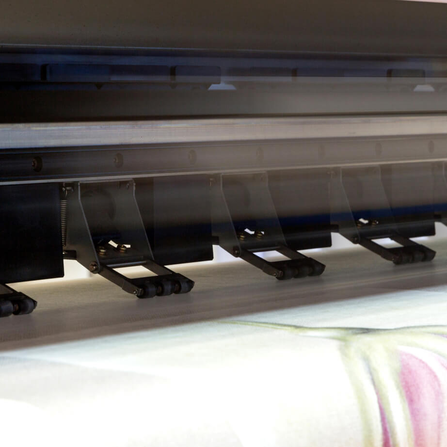 Atelier impression : mise en couleur: Le tissu passe ensuite à l’impression numérique, technologie que nous maîtrisons depuis plus de 20 ans. Nos imprimantes jet d’encre haute précision permettent une reproduction fidèle des motifs, une richesse chromatique élevée et une personnalisation totale — de la petite à la moyenne série. Chaque passage est calibré pour garantir stabilité, netteté des contours et saturation optimale.