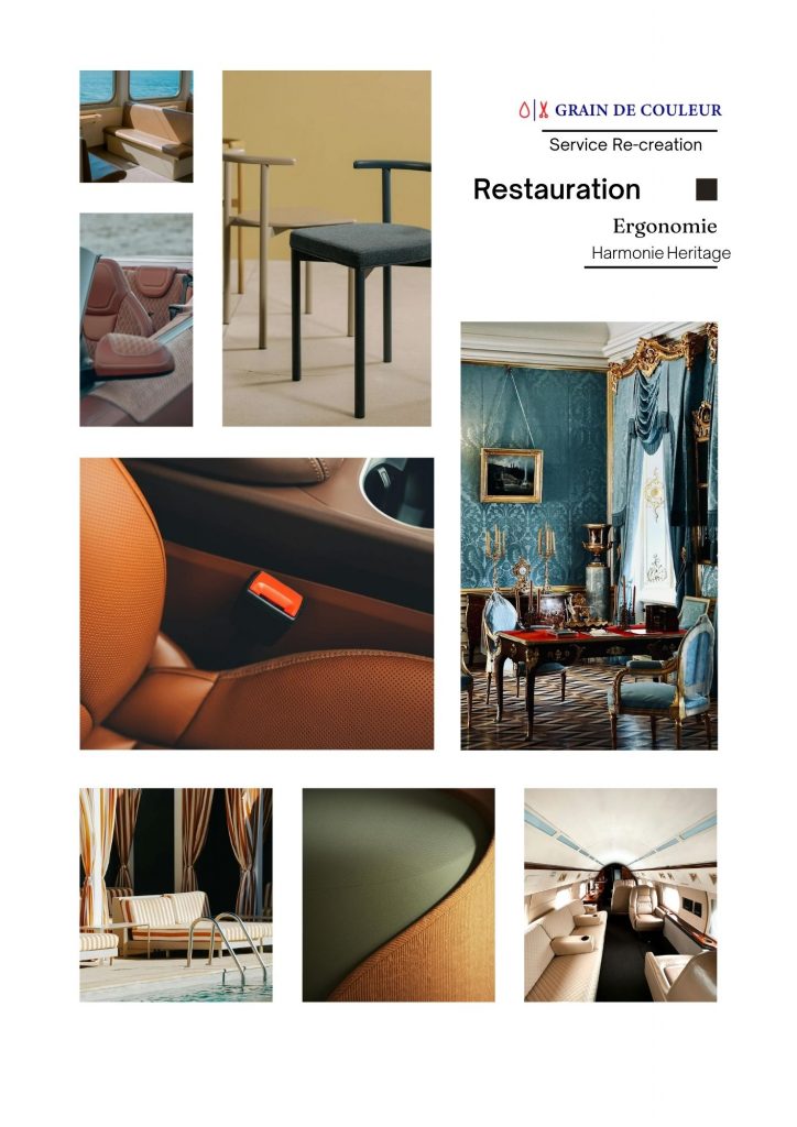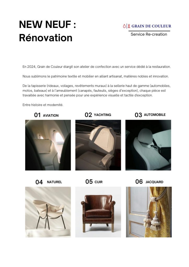 Pensée pour sublimer l’existant, l’offre Rénovation redonne toute leur valeur aux pièces de caractère : fauteuils, canapés, chaises, têtes de lit, panneaux ou rideaux. Qu’il s’agisse de mobilier hôtelier, de sellerie automobile ou de sièges d’avion, chaque projet est abordé avec exigence, précision et sens du détail.
