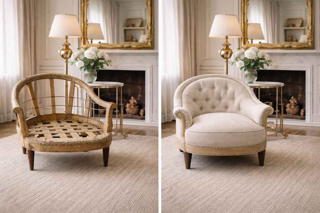 Tapisserie, sellerie haut de gamme et ameublement : chaque intervention est pensée pour révéler le caractère de la pièce, en magnifier les lignes et lui offrir une nouvelle vie, à la fois durable, élégante et distinctive.